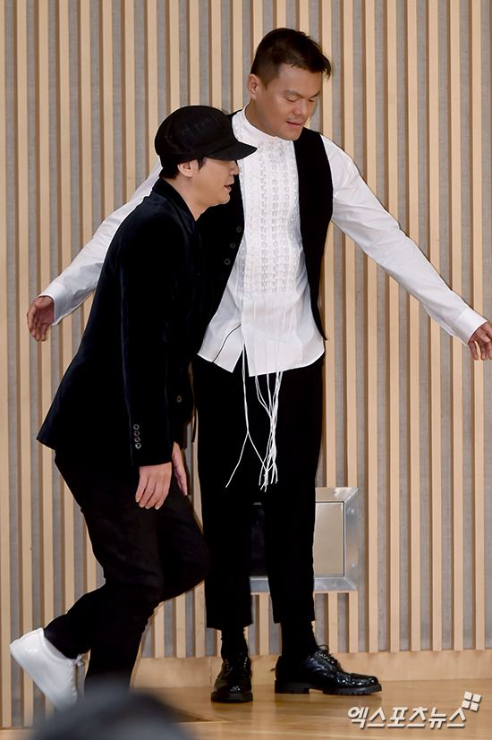 ‘K팝스타 6’ 제작발표회에 참석한 가수 양현석, 박진영이 입장하고 있다.