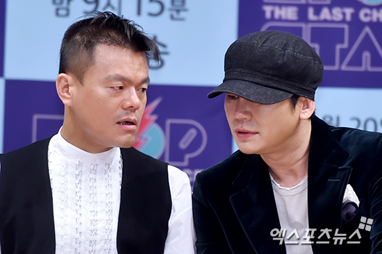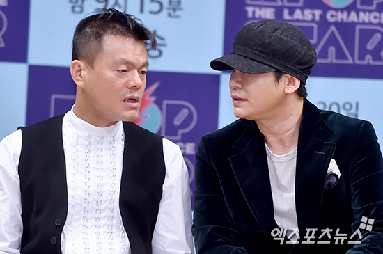 ‘K팝스타 6’ 제작발표회에 참석한 박진영, 양현석이 기자간담회 도중 귓속말을 나누고 있다.