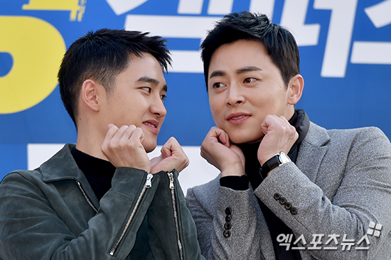 [엑스포츠뉴스 서예진 기자] 11일 오후 서울 돈암동 성신여대 잔디광장에서 진행된 영화 ‘형’ 캠퍼스 어택에 참석한 배우 도경수, 조정석이 포토타임을 갖고 있다.