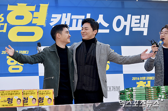 [엑스포츠뉴스 서예진 기자] 11일 오후 서울 돈암동 성신여대 잔디광장에서 진행된 영화 ‘형’ 캠퍼스 어택에 참석한 배우 도경수, 조정석이 포토타임을 갖고 있다.