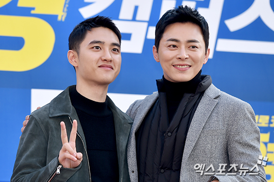[엑스포츠뉴스 서예진 기자] 11일 오후 서울 돈암동 성신여대 잔디광장에서 진행된 영화 ‘형’ 캠퍼스 어택에 참석한 배우 도경수, 조정석이 포토타임을 갖고 있다.