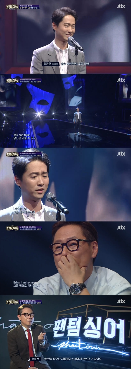 대기업에 다니는 '순수 아마추어' 임광현은 "잘 하는 사람들 사이에서 눈에 한 번 띄어보겠다"고 각오를 밝혔다. 뮤지컬 '레미제라블'의 '브링 힘 홈'을 선택한 임광현은 아마추어라고는 믿을 수 없는 실력을 뽐내 모든 심사위원의 눈길을 끌었다.