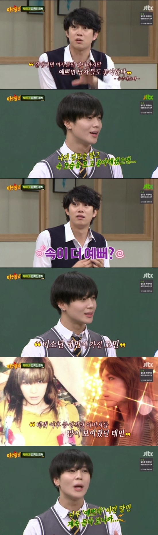 이날 태민은 자신의 외양만을 보고 "너무 예쁘다는 말만 들어서 고민"이라고 털어놨다. 앨범을 준비하며 장발을 하는 등 중성적인 이미지들을 많이 선보였던 것에 대한 걱정을 드러냈다.