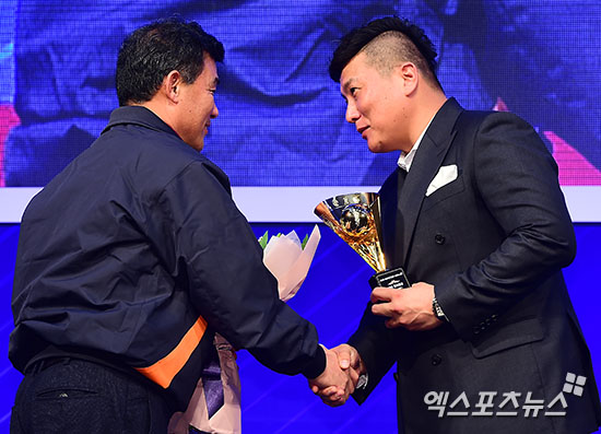 [엑스포츠뉴스 김한준 기자] 14일 오후 서울 양재동 The-K 호텔 컨벤션센터에서 열린 '2016 타이어뱅크 KBO 시상식’에서 출루율상을 수상한 한화 김태균이 박종훈 단장의 축하를 받고 있다.