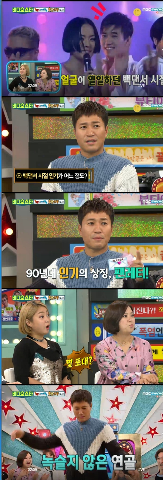 김종민은 몸을 풀더니 박력있는 댄스를 선보여 MC들을 놀라게 했다.