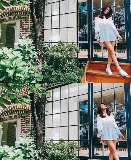25일 설현은 자신의 인스타그램에 두 장의 사진을 게재했다. 오프숄더 형태의 미니 원피스를 입은 설현은 짧은 치마 밑으로 긴 다리를 뽐내고 있다.