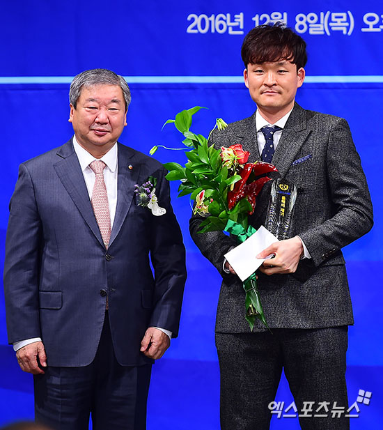 [엑스포츠뉴스 김한준 기자] 8일 오후 서울 논현동 임피리얼 팰리스호텔에서 열린 '2016 프로야구 스포츠서울 올해의 상' 시상식에서 올해의 재기상을 수상한 NC 원종현이 기념촬영을 갖고 있다.