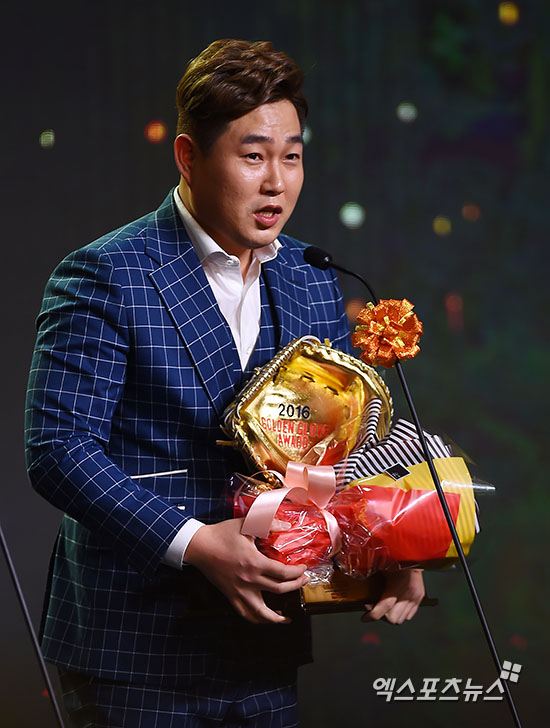 [엑스포츠뉴스 김한준 기자] 13일 오후 서울 양재동 The-K 호텔 그랜드볼룸에서 열린 '2016 타이어뱅크 KBO 골든글러브 시상식'에서 포수 부문을 수상한 두산 양의지가 수상소감을 말하고 있다.
