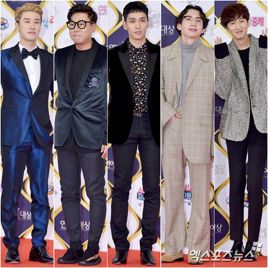 [엑스포츠뉴스 서예진 기자] 24일 오후 서울 여의도동 KBS 신관 공개홀에서 열린 ‘2016 KBS 연예대상’에 참석한 산이(완쪽부터), 이상민, 최태준, 봉태규, 이광수가 포토타임을 갖고 있다.