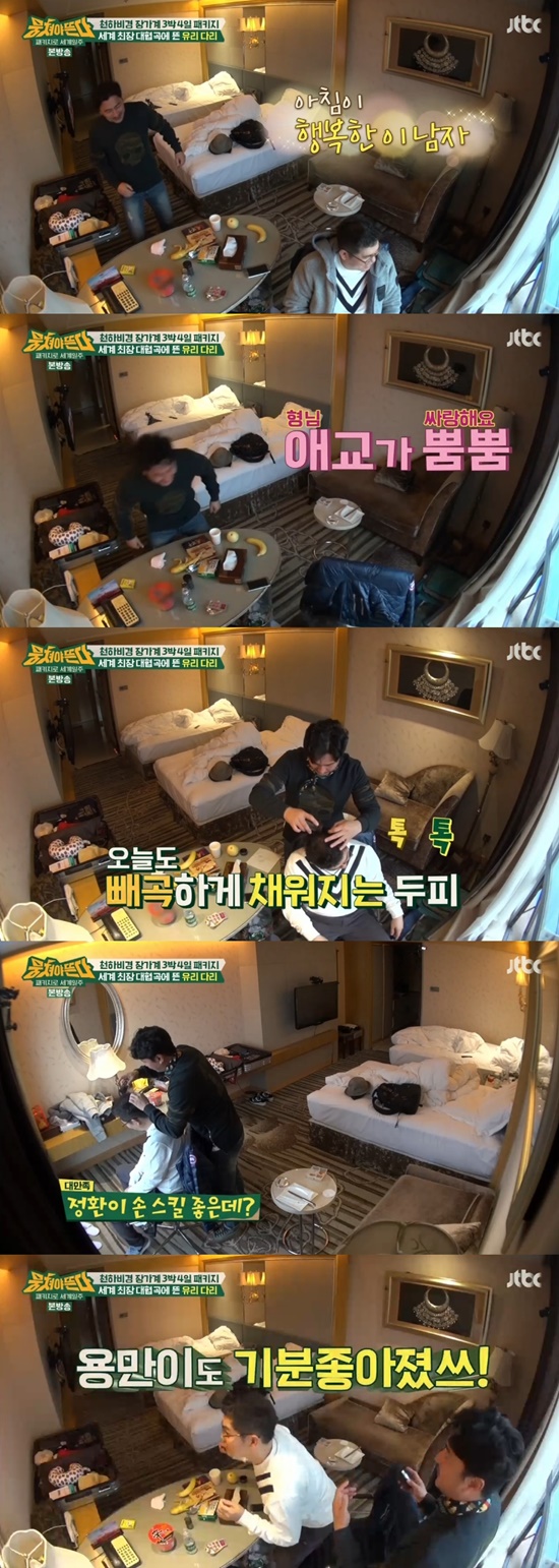김용만은 활짝 웃으며 "오늘도 모발 케어를 부탁한다"고 했고, 안정환은 김용만의 흑채를 손수 뿌려 웃음을 자아냈다.
