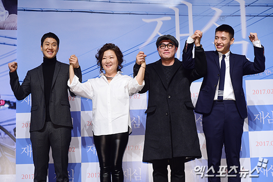 [엑스포츠뉴스 박지영 기자] 10일 오전 서울 신사동 CGV 압구정에서 열린 영화 '재심'(감독 김태윤) 제작보고회에 참석한 배우 정우, 김해숙, 강하늘, 김태윤 감독이 포토타임을 갖고 있다.