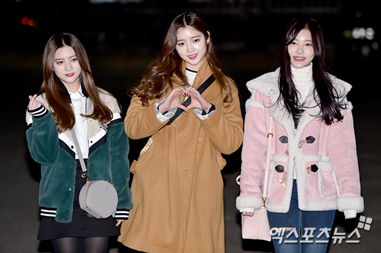 [엑스포츠뉴스 서예진 기자] 13일 오전 서울 여의도동 KBS신관에서 열린 KBS '뮤직뱅크' 리허설에 참석한 다이아 은채, 은진, 제니가 출근길에 나서고 있다.