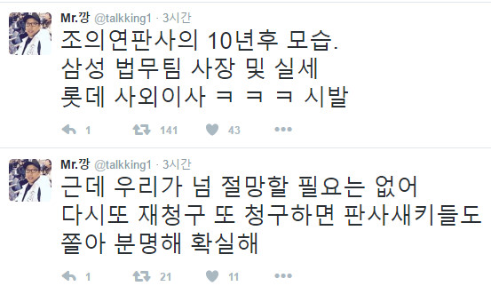 강병규는 19일 자신의 SNS에 "조의연판사의 10년 후 모습. 삼성 법무팀 사장 및 실세 롯데 사외이사"라고 게재했다. 이어"조의연 판사는 옷 벗고 롯데도 가고 삼성도 갈 생각에 웃고 있겠지"라고 덧붙였다.