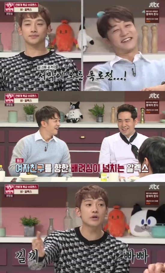 또 비와 김태희는 싸운 뒤 어떻게 푸는 것 같냐는 물음에 알렉스는 "가방?"이라고 너스레를 떤 뒤 "사실이 아니다"라고 즉각 해명해 웃음을 자아냈다.