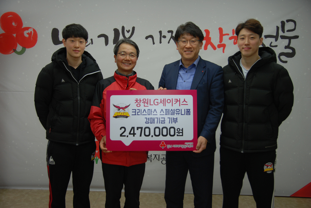 [엑스포츠뉴스 채정연 인턴기자] 창원 LG 세이커스가 1월 26일사랑의 열매 경남지부에서 '희망 2017 나눔 캠페인'의 일환으로 크리스마스 스페셜 유니폼 경매 금액 2,470,000원을 경남사회 복지공동모금회(회장 한철수)에 기부하는 전달식을 가졌다.