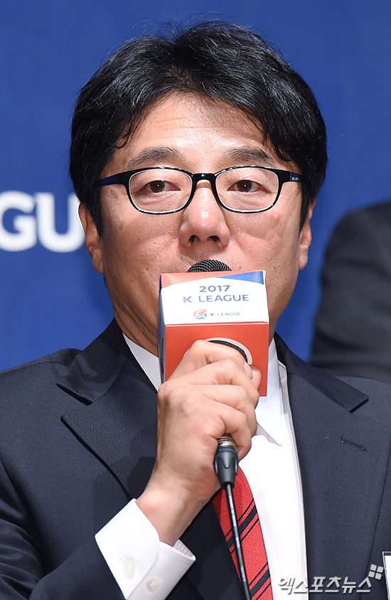 [엑스포츠뉴스 박지영 기자] 23일 오후 서울 논현동 파티오나인에서 열린 '2017 K리그 클래식 미디어데이'에 참석한 FC서울 황선홍 감독이 인사하고 있다.
