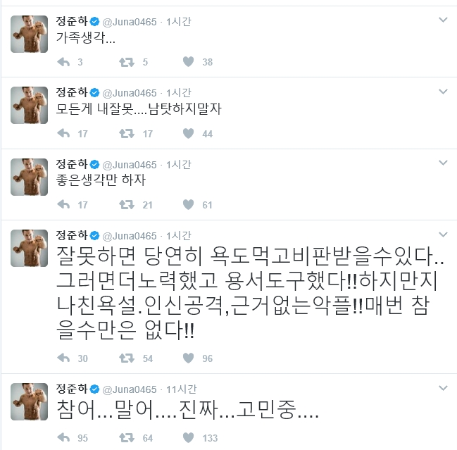 실제로 정준하 또한 이날 자신의 트위터를 통해 "참어..말어..진짜..고민중"이라는 글을 올렸고, 26일에도 "잘못하면 당연히 욕도 먹고 비판 받을 수 있다. 그러면 더 노력했고 용서도 구했다! 하지만 지나친 욕설. 인신공격, 근거없는 악플!! 매번 참을 수만은 없다"를 비롯해 "좋은 생각만 하자", "모든게 내 잘못, 남 탓하지 말자", "가족 생각" 등의 트윗을 연이어 게재하며 복잡한 심경을 드러냈다.