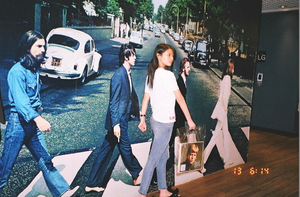 공개된 사진 속 설현은 그룹 비틀즈의 사진 앞에서 같은 포즈를 취하고 있다. 특히 흰 티에 청바지로 청순미를 물씬 풍겼다.