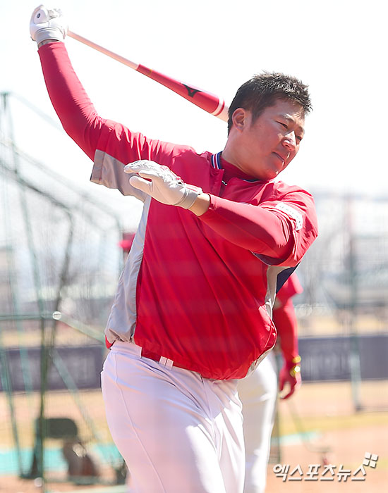 [엑스포츠뉴스 광주, 김한준 기자] 15일 오후 광주-KIA 챔피언스필드에서 열리는 '2017 타이어뱅크 KBO리그' 두산 베어스와 KIA 타이거즈의 시범경기, KIA 최형우가 토스배팅을 하고 있다.
