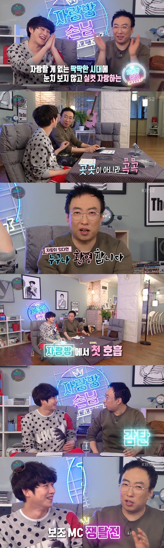16일 방송된 KBS 2TV 새 파일럿 프로그램 '자랑방손님'에서는 MC 박명수와 김희철이 시청자들에게 인사를 전했다.