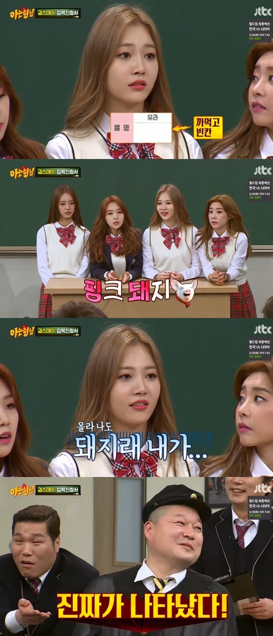 이날 유라는 입학신청서에 별명을 까먹고 적지 않았다. 이에 '아는형님' 멤버들은 별명을 물었고, 유라는 "돼지다. 멤버들이 핑크돼지라고 부른다"고 고백했다.