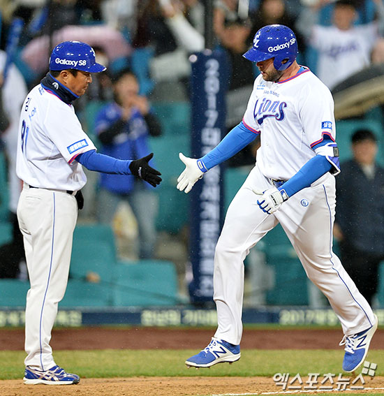[엑스포츠뉴스 대구, 김한준 기자] 31일 오후 대구삼성라이온즈파크에서 열린 '2017 타이어뱅크 KBO리그' KIA 타이거즈와 삼성 라이온즈의 경기, 9회말 1사 삼성 러프가 솔로 홈런을 날린 후 김호 코치와 하이파이브를 하고 있다.