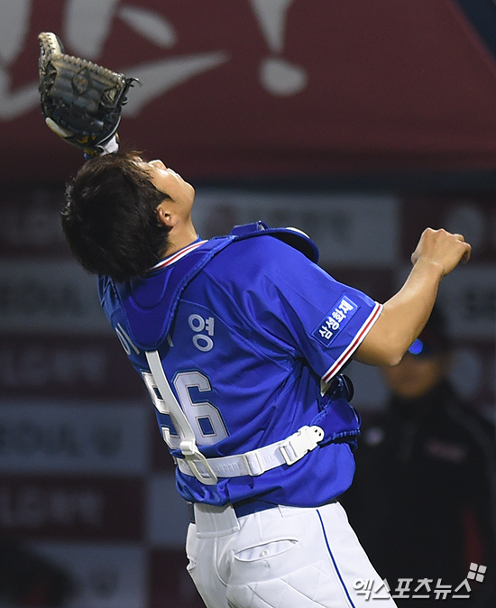 [엑스포츠뉴스 박지영 기자] 4일 오후 서울 송파구 잠실야구장에서 열린 '2017 타이어뱅크 KBO리그' 삼성 라이온즈와 LG 트윈스의 경기, 4회말 2사 1,2루 삼성 이지영이 LG 유강남의 타구를 잡아내며 이닝종료시키고 있다.