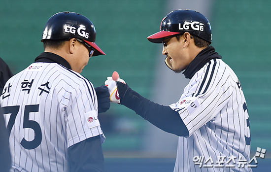 [엑스포츠뉴스 박지영 기자] 6일 오후 서울 송파구 잠실야구장에서 열린 '2017 타이어뱅크 KBO리그' 삼성 라이온즈와 LG 트윈스의 경기, 1회말 1사 3루 LG 박용택이 적시타를 때려낸 뒤 1루에서 한혁수 주루코치와 하이파이브를 하고 있다.