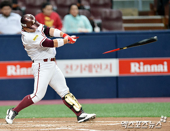 [엑스포츠뉴스 김한준 기자] 13일 오후 서울 구로구 고척스카이돔에서 열린 '2017 타이어뱅크 KBO리그' kt 위즈와 넥센 히어로즈의 경기, 2회말 1사 1,3루 넥센 윤석민이 타격을 하고 있다. 결과는 병살타 아웃.