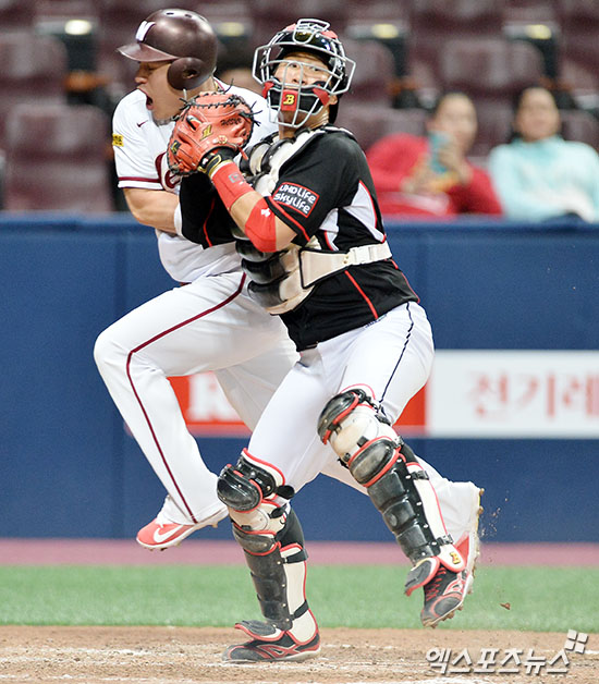 [엑스포츠뉴스 김한준 기자] 13일 오후 서울 구로구 고척스카이돔에서 열린 '2017 타이어뱅크 KBO리그' kt 위즈와 넥센 히어로즈의 경기, 4회말 1사 만루 넥센 박동원이 윤석민의 1루수 앞 땅볼 타구때 득점에 성공하고 있다.