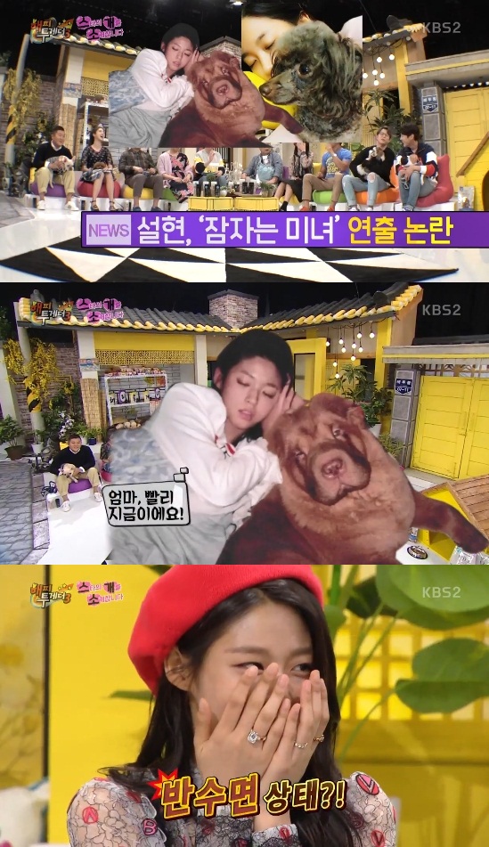 이날 설현은 반려견들과 찍은 사진을 공개해 눈길을 끌었다. 설현이 취침 중 반려견들과 함께 있는 모습을 어머니가 찍은 것인데, MC들은 이에 의심을 품었다. 연출된 것 같다는 지적이었다.