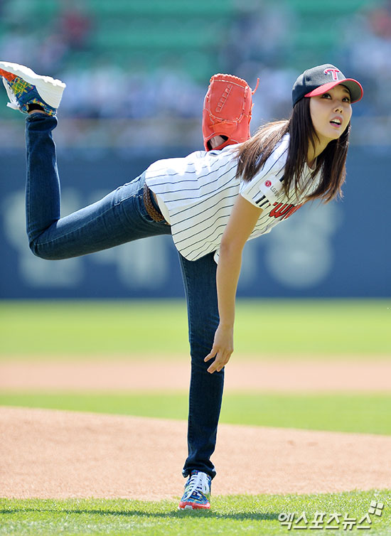 [엑스포츠뉴스 김한준 기자] 23일 오후 서울 송파구 잠실야구장에서 열린 '2017 타이어뱅크 KBO리그' KIA 타이거즈와 LG 트윈스의 경기, 경기 전 모델 한혜진이 시구에 임하고 있다.