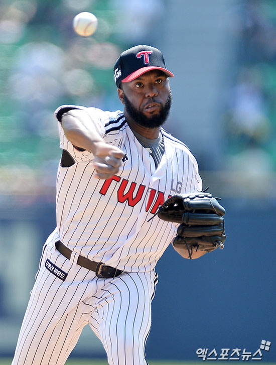 [엑스포츠뉴스 김한준 기자] 23일 오후 서울 송파구 잠실야구장에서 열린 '2017 타이어뱅크 KBO리그' KIA 타이거즈와 LG 트윈스의 경기, 1회초 LG 선발투수 소사가 공을 힘차게 던지고 있다.