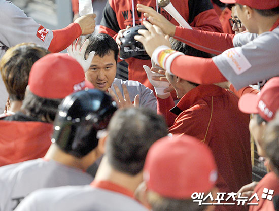 [엑스포츠뉴스 김한준 기자] 25일 오후 서울 송파구 잠실야구장에서 열린 '2017 타이어뱅크 KBO리그' SK 와이번스와 LG 트윈스의 경기, 9회초 1사 SK 최정이 솔로 홈런을 날린 후 더그아웃에서 하이파이브를 하고 있다.