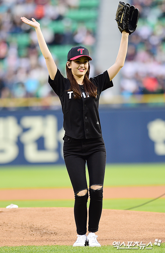 [엑스포츠뉴스 박지영 기자] 4일 오후 서울 송파구 잠실야구장에서 열린 '2017 타이어뱅크 KBO리그' NC 다이노스와 LG 트윈스의 경기에 앞서 가수 전소미가 LG 트윈스의 승리를 기원하는 시구를 한 뒤 인사하고 있다.