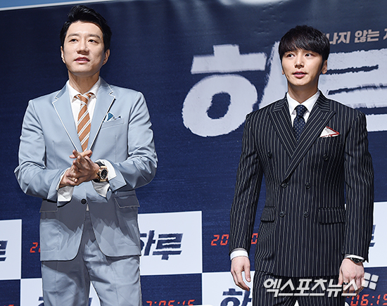 [엑스포츠뉴스 박지영 기자] 12일 오전 서울 CGV 압구정점에서 열린 영화 '하루'(감독 조선호) 제작보고회에 참석한 배우 김명민과 변요한이 인사하고 있다.