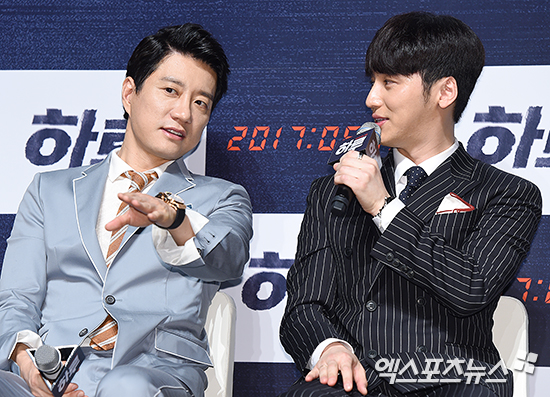 [엑스포츠뉴스 박지영 기자] 12일 오전 서울 CGV 압구정점에서 열린 영화 '하루'(감독 조선호) 제작보고회에 참석한 배우 김명민과 변요한이 이야기를 나누고 있다.