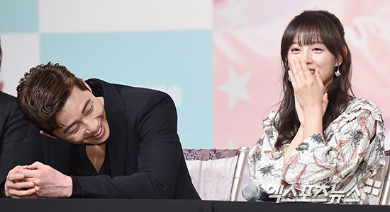 [엑스포츠뉴스 박지영 기자] 18일 오후 서울 영등포구 타임스퀘어 아모리스홀에서 열린 KBS 2TV 새 월화드라마 '쌈, 마이웨이' 제작발표회에 참석한 배우 박서준과 김지원이 김성오의 시청률 공약 발언에 웃음을 터뜨리고 있다.