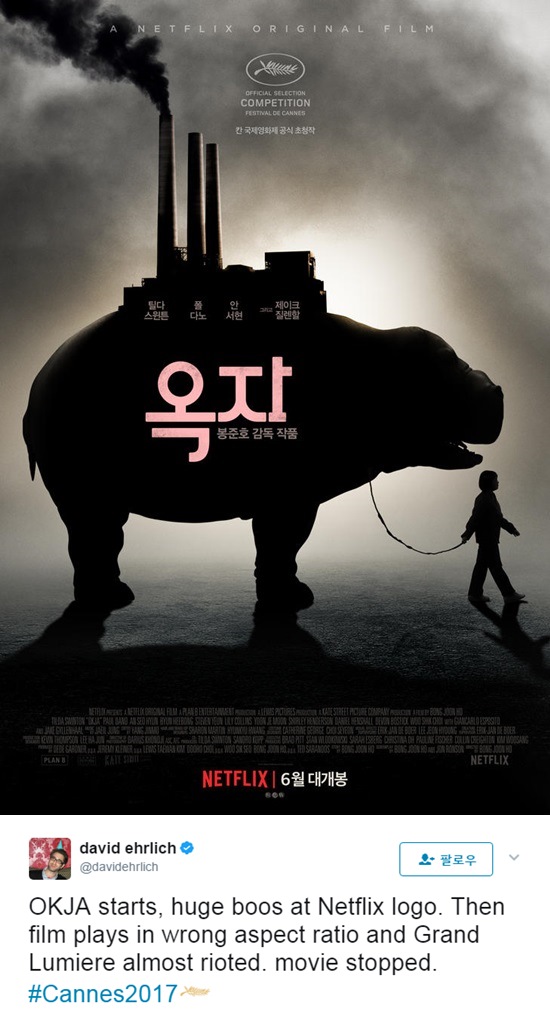 로이터 통신 등 외신에 따르면 19일 오전(현지시간) 프랑스 칸 뤼미에르 극장에서 진행된 '옥자' 기자 시사회는 상영 5분 만에 갑자기 중단됐고 관객으로부터 엄청난 야유가 쏟아진 것으로 확인됐다.