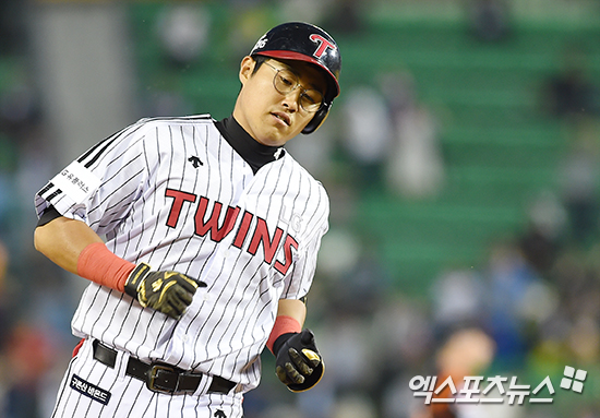 [엑스포츠뉴스 박지영 기자] 19일 오후 서울 송파구 잠실야구장에서 열린 '2017 타이어뱅크 KBO리그' 롯데 자이언츠와 LG 트윈스의 경기, 4회말 2사 2루 LG 채은성이 투런 홈런을 때려낸 뒤 베이스를 돌고 있다.
