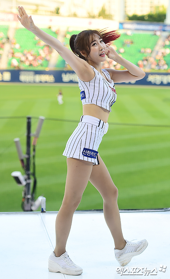 [엑스포츠뉴스 박지영 기자] 19일 오후 서울 송파구 잠실야구장에서 열린 '2017 타이어뱅크 KBO리그' 롯데 자이언츠와 LG 트윈스의 경기, LG 치어리더가 멋진 공연을 선보이고 있다.