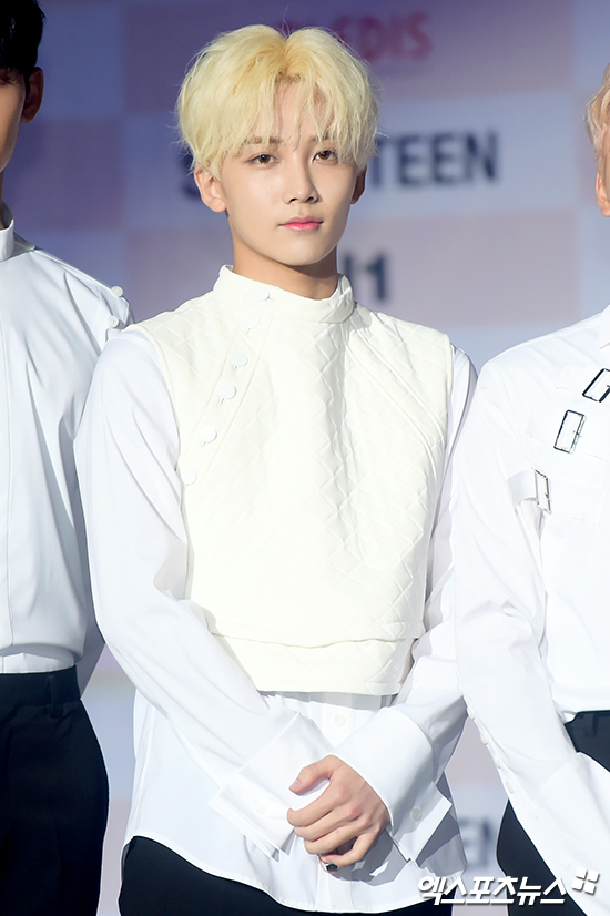 [엑스포츠뉴스 서예진 기자] 23일 오후 서울 방이동 올림픽공원 올림픽홀에서 열린 그룹 세븐틴의 네 번째 미니앨범 ’A/1’ 발매 쇼케이스에 참석한 세븐틴 정한이 포토타임을 갖고 있다.