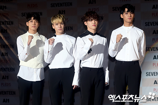[엑스포츠뉴스 서예진 기자] 23일 오후 서울 방이동 올림픽공원 올림픽홀에서 열린 그룹 세븐틴의 네 번째 미니앨범 ’A/1’ 발매 쇼케이스에 참석한 세븐틴이 포토타임을 갖고 있다.