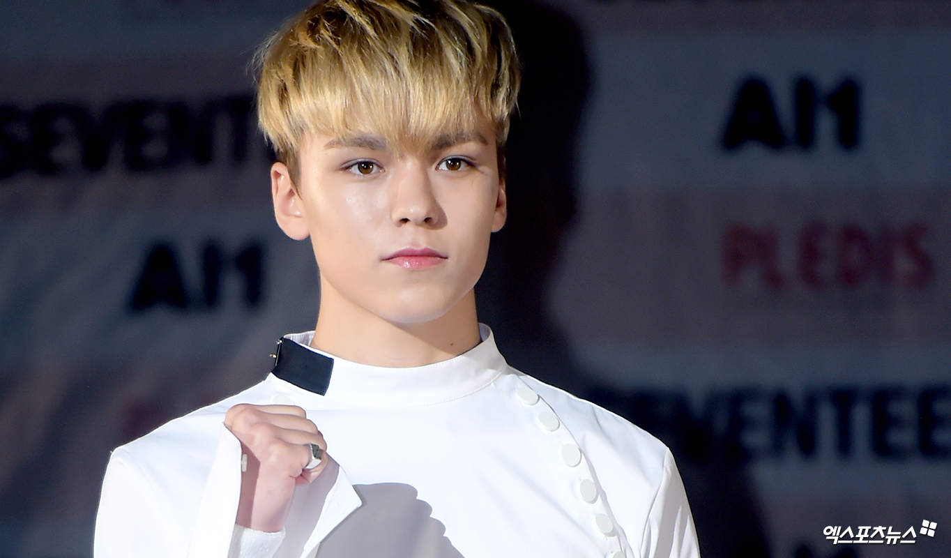 [엑스포츠뉴스 서예진 기자] 23일 오후 서울 방이동 올림픽공원 올림픽홀에서 열린 그룹 세븐틴의 네 번째 미니앨범 ’A/1’ 발매 쇼케이스에 참석한 세븐틴 버논이 포토타임을 갖고 있다.