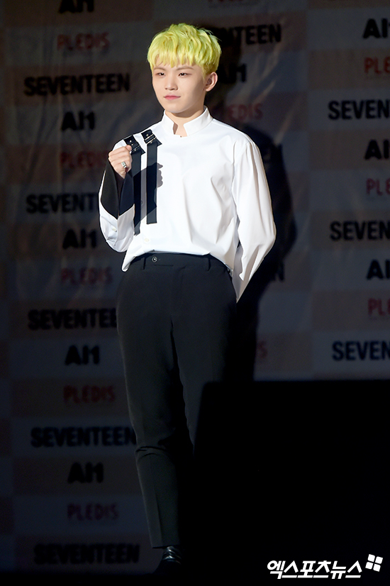 [엑스포츠뉴스 서예진 기자] 23일 오후 서울 방이동 올림픽공원 올림픽홀에서 열린 그룹 세븐틴의 네 번째 미니앨범 ’A/1’ 발매 쇼케이스에 참석한 세븐틴 우지가 포토타임을 갖고 있다.