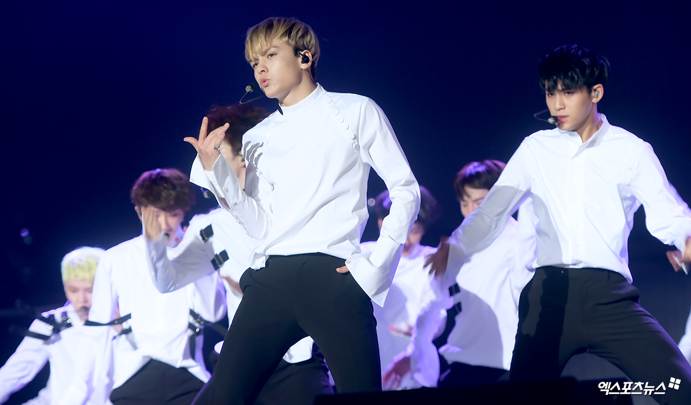 [엑스포츠뉴스 서예진 기자] 23일 오후 서울 방이동 올림픽공원 올림픽홀에서 열린 그룹 세븐틴의 네 번째 미니앨범 ’A/1’ 발매 쇼케이스에 참석한 세븐틴이 멋진 공연을 선보이고 있다.