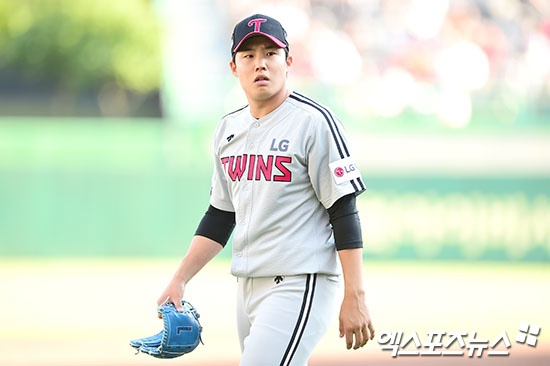 [엑스포츠뉴스 인천, 김한준 기자] 27일 오후 인천SK행복드림구장에서 열린 '2017 타이어뱅크 KBO리그' LG 트윈스와 SK 와이번스의 경기, 1회말 수비를 마친 LG 선발투수 임찬규가 더그아웃을 향햐고 있다.