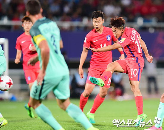 [엑스포츠뉴스 천안, 김한준 기자] 30일 오후 충남 천안종합운동장에서 열린 'FIFA U-20 월드컵 코리아 2017' 대한민국과 포르투갈의 16강 경기, 대한민국 이승우가 슈팅을 시도하고 있다.