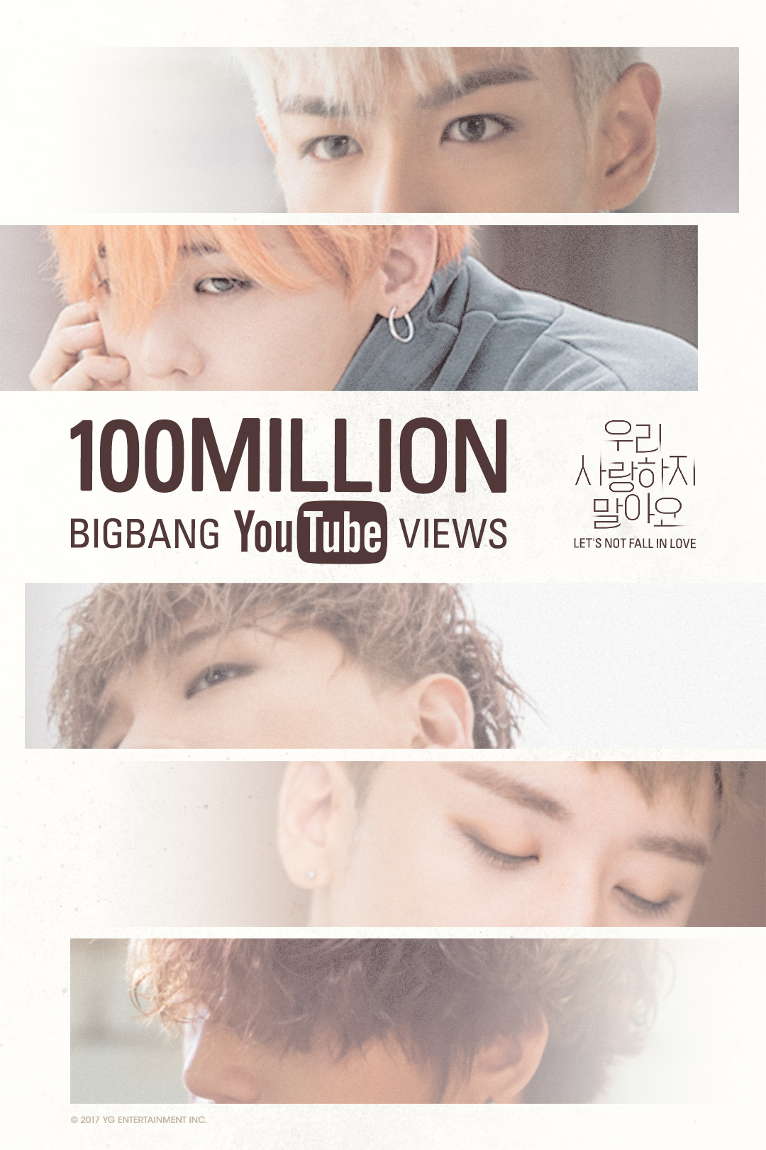 ‘우리 사랑하지 말아요’ 뮤직비디오는 31일 오전 11시 20분 기준 1억뷰를 넘어섰다. ‘판타스틱 베이비’, ‘뱅뱅뱅’, ‘굿보이’, ‘LOSER’, ‘삐딱하게’, ‘BAD BOY’에 이어 7번째로 유튜브에서 억대 뷰수를 기록한 뮤직비디오에 이름을 올린 것.