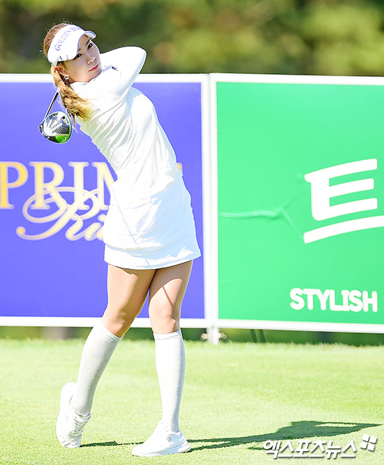 [엑스포츠뉴스 제주, 김한준 기자] 2일 제주특별자치도 서귀포시 롯데스카이힐 제주컨트리클럽(파72. 6,289야드)에서 열린 '제6회 롯데 칸타타 여자오픈(총상금 6억 원, 우승상금 1억2천만 원)' 1라운드 경기, 유현주(23, 골든블루)가 18번홀 티샷을 날리고 있다.